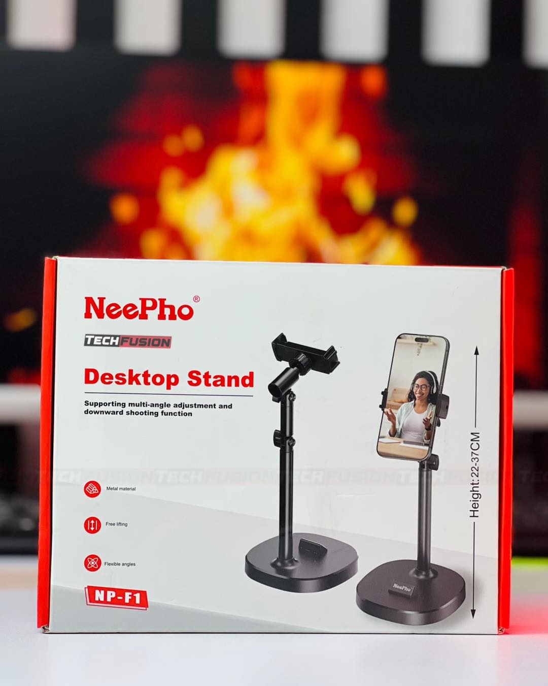 Neepho NP-F1 (المعروف أيضًا بأسماء تقنية مشابهة مثل NP-999) حاملًا مكتبيًا مدمجًا مصممًا للهواتف الذكية والكاميرات الرقمية الصغيرة، وهو مثالي لصناع المحتوى الذين يحتاجون إلى أداة خفيفة الوزن وسهلة الحمل للاستخدام المكتبي أو أثناء التنقل.